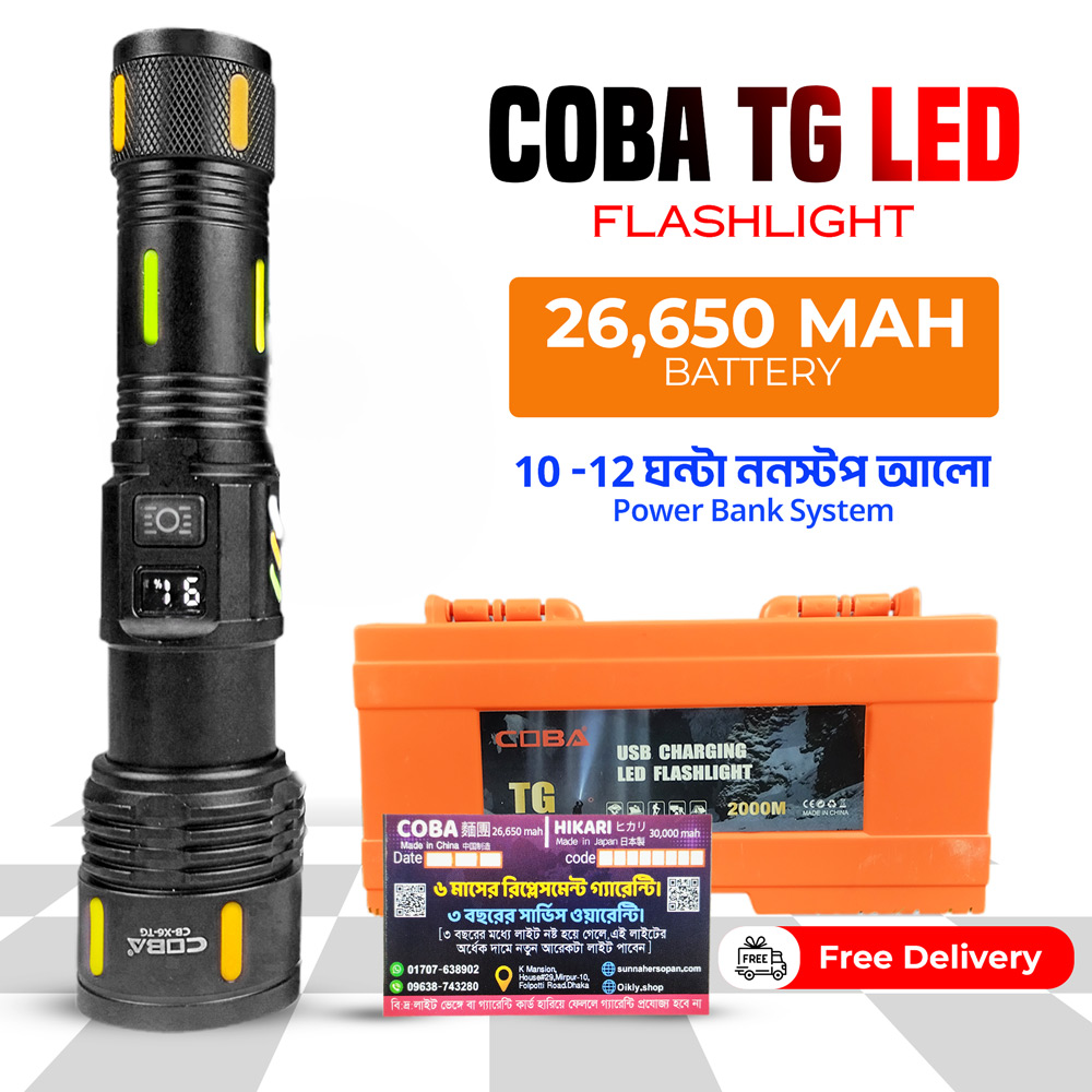 🛡️৬ মাস রিপ্লেসমেন্ট গ্যারান্টি + 🕒 ৩ বছরের ওয়ারেন্টিসহ শক্তিশালী COBA TG  ব্র্যান্ডেড টর্চলাইট।